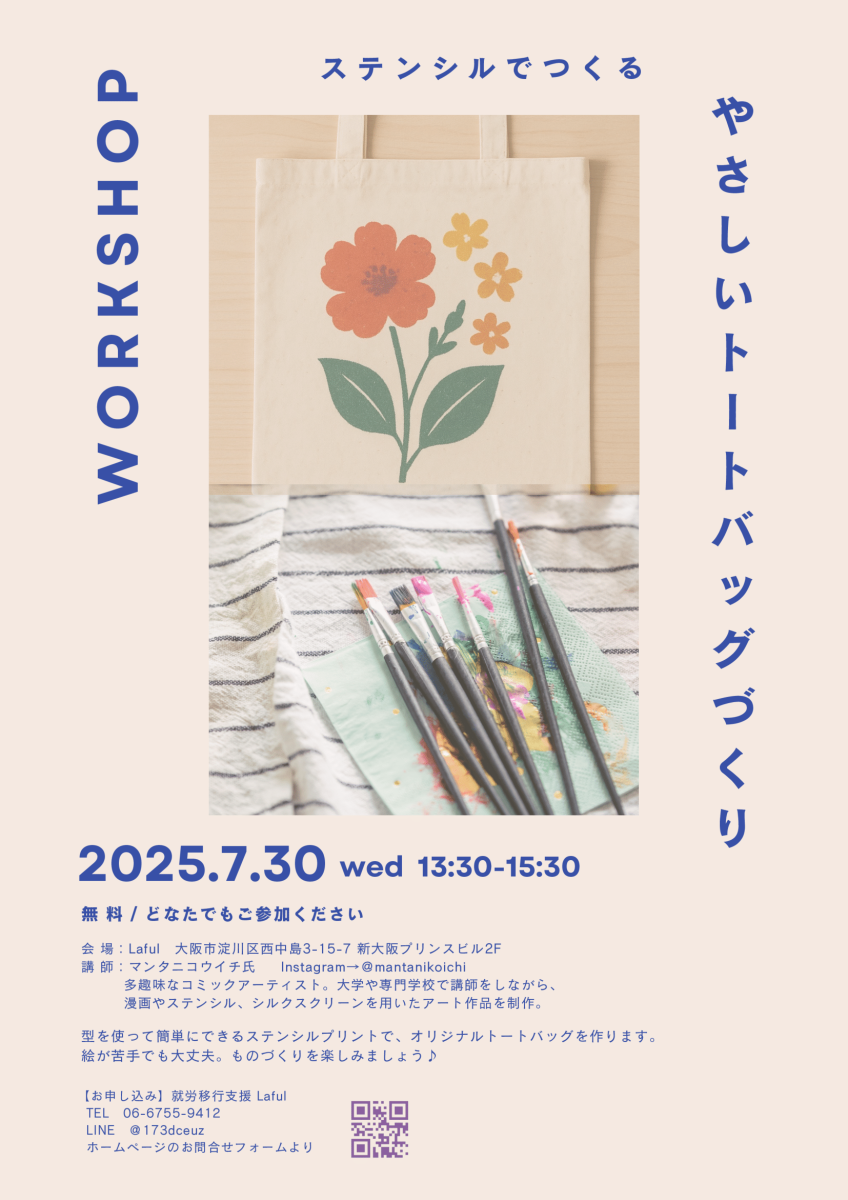 7/30(水)ワークショップを開催いたします。 2025/05/29 Lafulからのお知らせです。 7月30日(水) 13:30~15:30に「ステンシルでつくるやさしいトートバッグづくり」を開催いたします。 詳細は下記のチラシをご参照ください。 みなさまのご参加をお待ちしております。