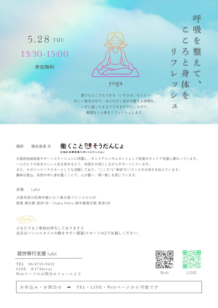 5/28(木)イベントを開催いたします。 2026/04/20 Lafulからのお知らせです。 4月22日水曜日 13:30~15:00に「呼吸を整えて、こころと身体をリフレッシュ いすヨガセミナー」を開催いたします。 詳細は下記のチラシをご参照ください。 みなさまのご参加をお待ちしております。