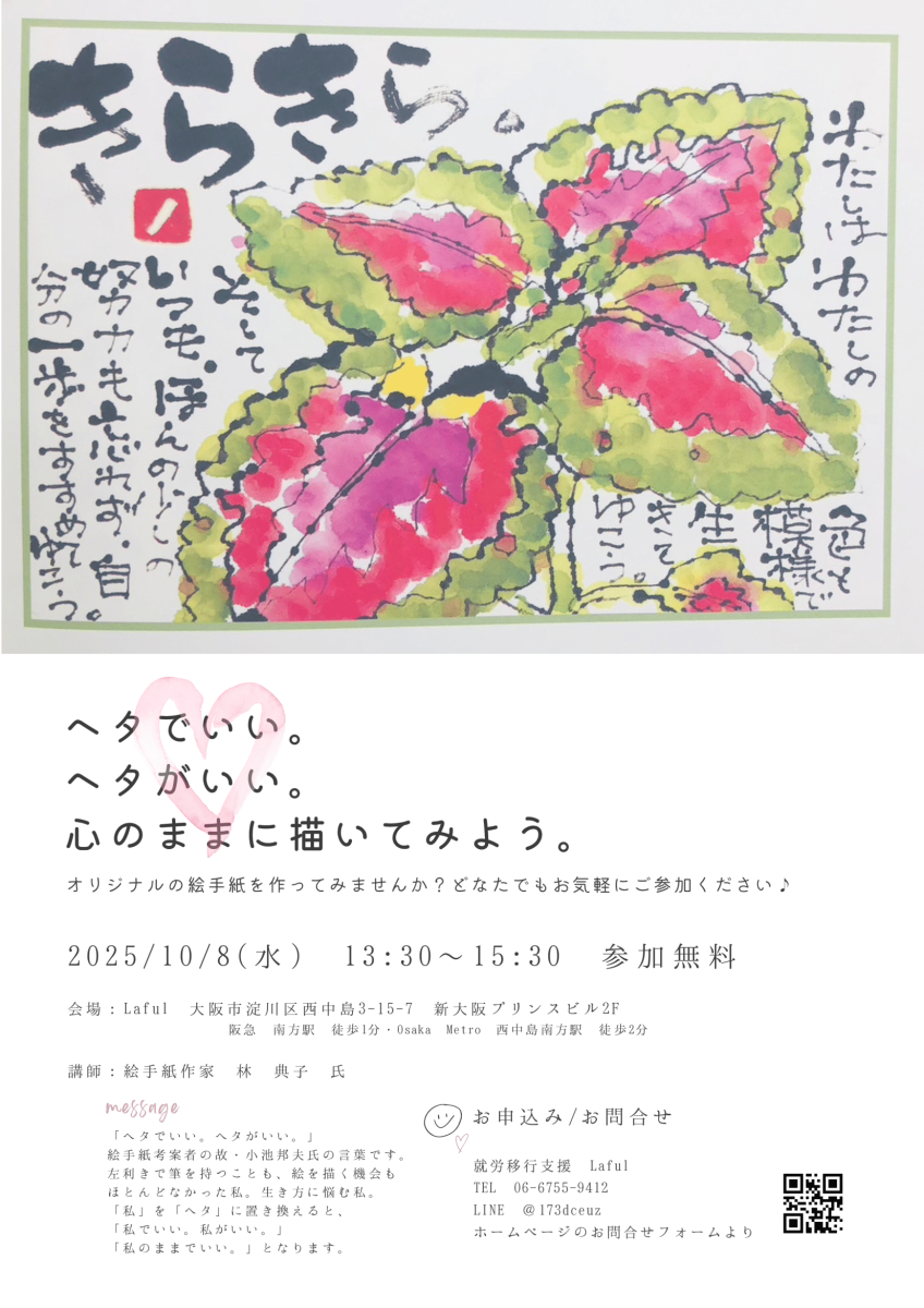10/8(水)ワークショップを開催いたします。 2025/08/28 Lafulからのお知らせです。 10月8日水曜日 13:30~15:30に「ヘタでいい。ヘタがいい。心のままに描いてみよう。」を開催いたします。 詳細は下記のチラシをご参照ください。 みなさまのご参加をお待ちしております。